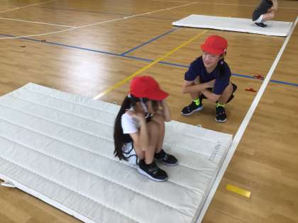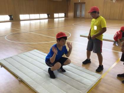 後転ができるように、後ろに手をついて戻る練習をしました。