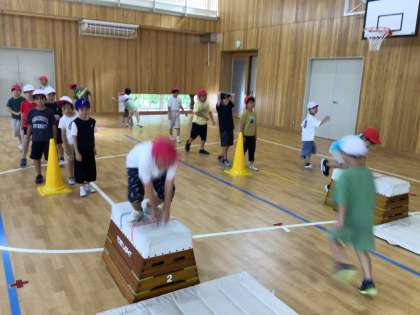 両足で乗る、手で支持して乗るを繰り返してから、実際に跳ぶ練習を進めました。