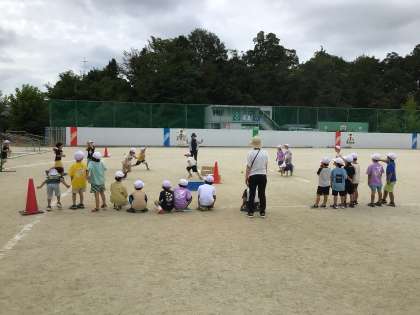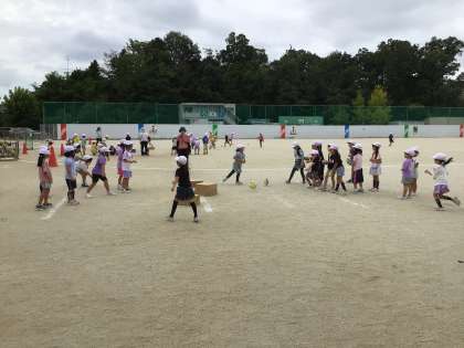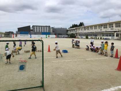 ボール投げ遊びで、的当てゲームをしました。体を思い切り使って投げたり、一生懸命に応援する姿が見られました。