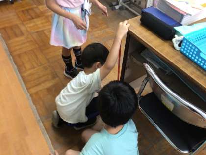 「おおきさくらべ」の学習で、教室にあるいろいろなものの高さを比べました。紙テープで長さを調べています。