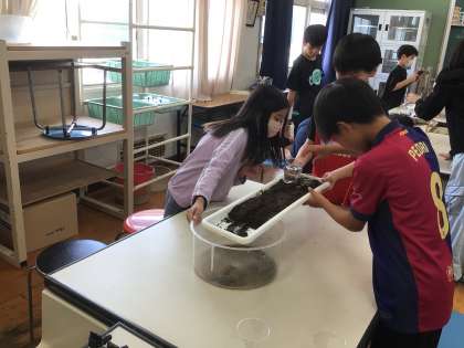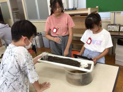 小さい川をつくって水を流し、流れた後の様子をタブレットで撮影しました。