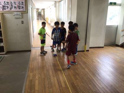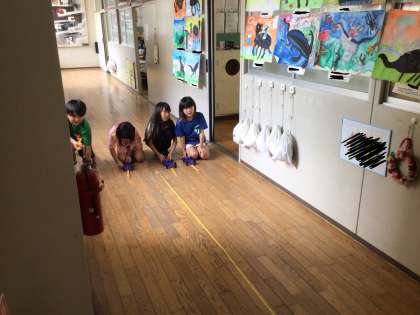 理科ではゴムの力を活かし車を走らせて学習をしています。かなりの距離が出て、子どもたちは楽しそうでした。