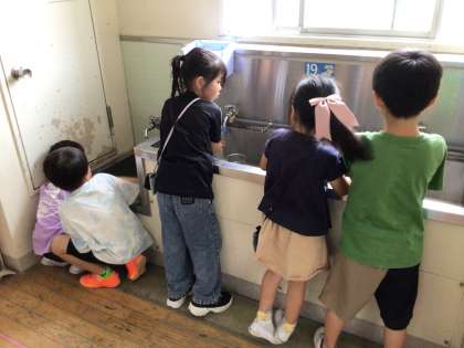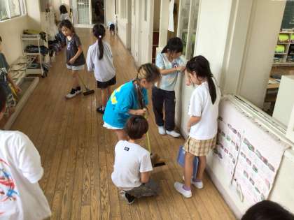 前期そうじ当番から、後期のそうじ当番へ引き継ぎをしました。