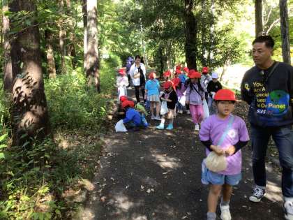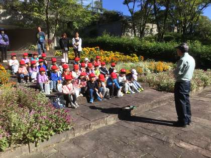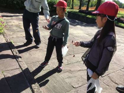 あきみつけの学習で、緑化センターへ行きました。センターの方から、どんぐりを使ったおもちゃを教えていただいたり、おもちゃ作りの材料としてどんぐりや落ち葉などを拾ってきました。