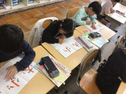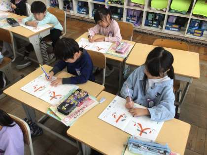 よい姿勢、鉛筆の持ち方に気をつけながら練習をしています。