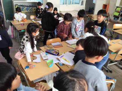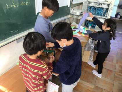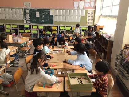 秋の落ち葉や木の実を使ったおもちゃでひらく「おもちゃまつり」の準備をしています。