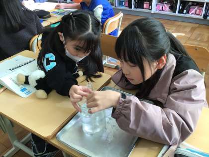 4年 理科 ものの温度と体積 公開日 2025/12/05 更新日 2025/12/05 各学年から 空気が温められたり冷やされたりするとどうなるのかを確かめるために、試験管に洗剤の膜をつけて調べました。