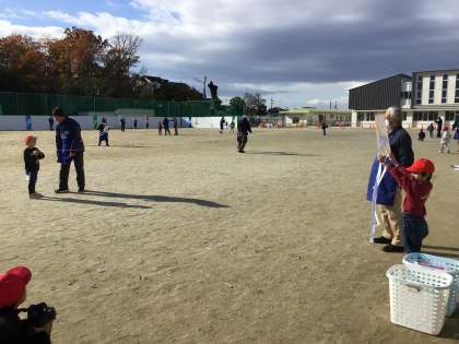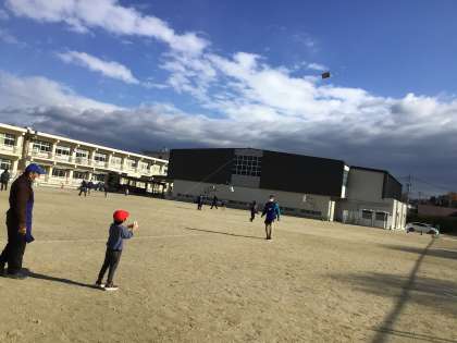 1年 凧揚げ その2(4) 公開日 2025/12/05 更新日 2025/12/05 各学年から 自分の凧で凧揚げをしました。風はいまいちでしたが、だんだんとコツをつかみみんな揚げることができました。