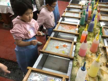 赤や青などの色のつけられた和紙の液を流し込んで模様をつけ