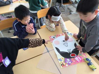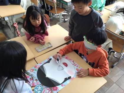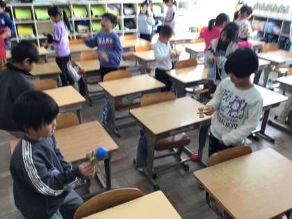 昔遊びを楽しんでいます。ふくわらいとけん玉の様子です。