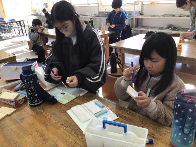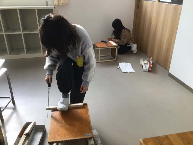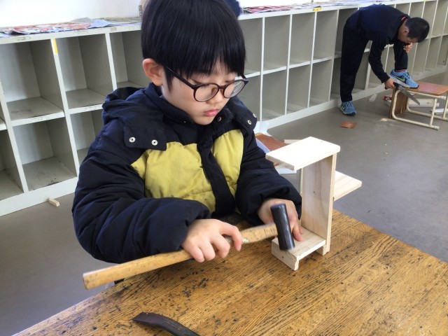 のこぎりの単元に入りました。のこぎりで木材を切り、ボンドや釘で組み上げていきます。