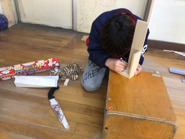 のこぎりを使う単元に入りました。木材をのこぎりで切り、組み合わせていきます。