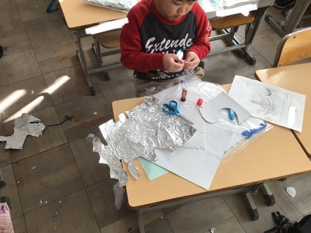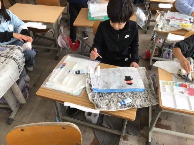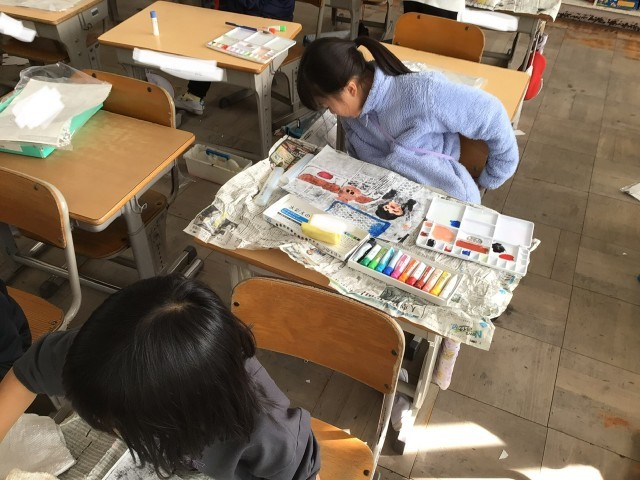 版を刷った後、後ろから絵の具で色を塗りました。乾けば完成です。