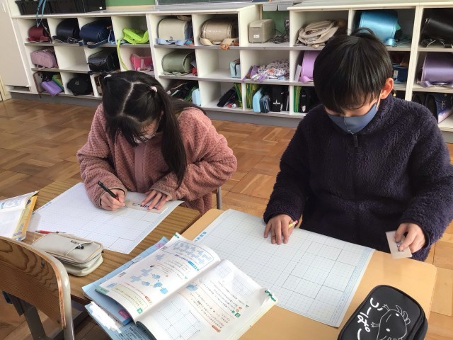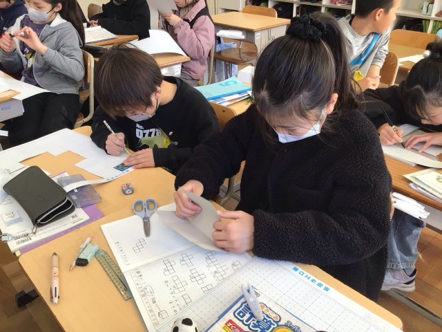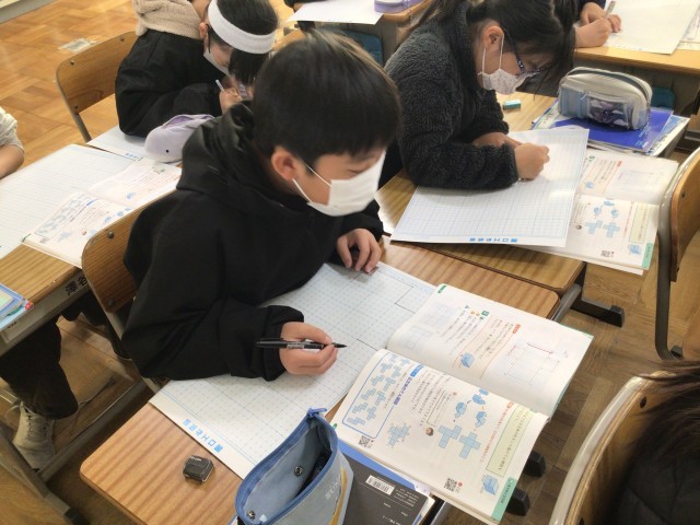 工作用紙に直方体や立方体の展開図をかき、実際に組み立てながら空間把握の力を高めていきます。