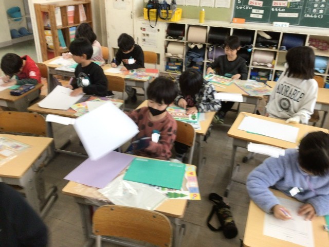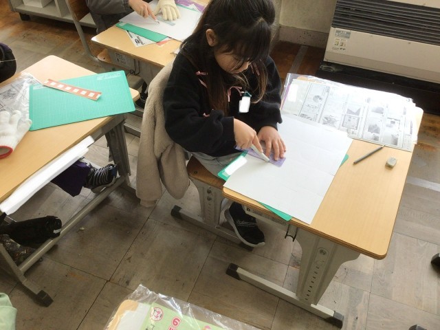 カッターを使って、工作を進めています。切りすぎて、窓を落としてしまう子もいましたが、ケガなく進めることができています。