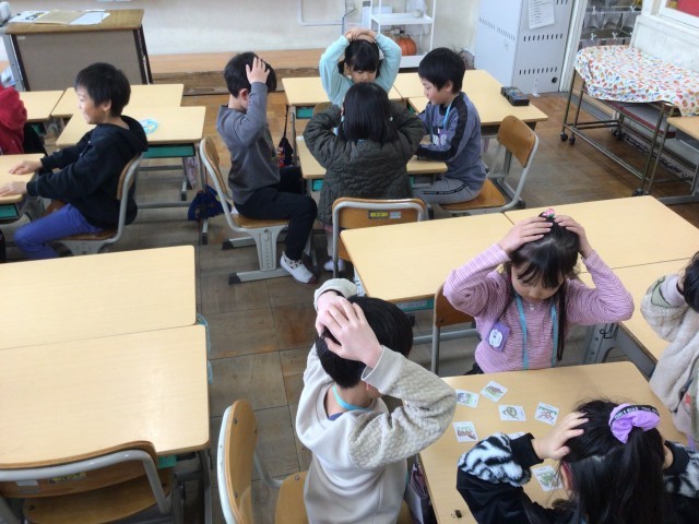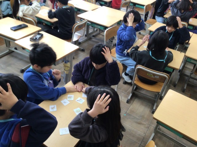 外国語活動で、動物の学習をしました。動物の鳴き方は、英語になると日本語とは違う言い方をすることが分かりました。丸ばつクイズやかるたを楽しみました。