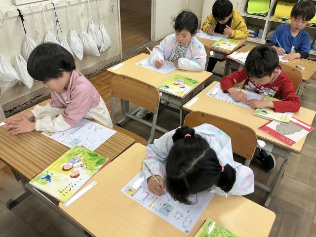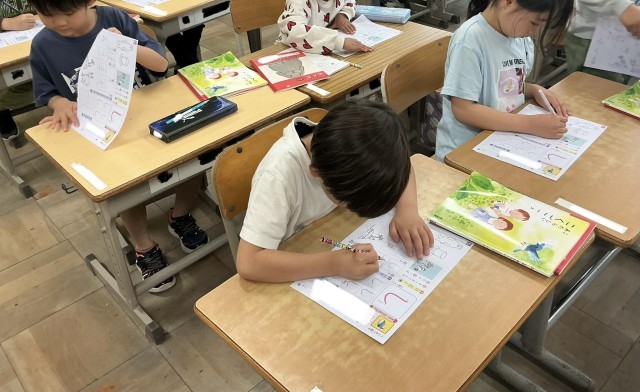 正しい姿勢で書けるように練習しています。