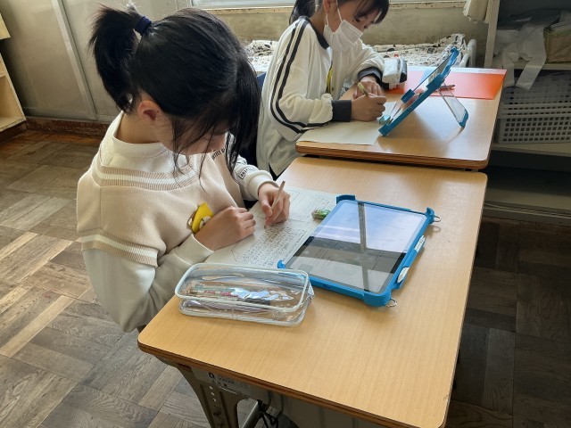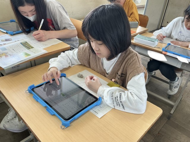 田植え体験に向けて、タブレットや教科者を活躍して米調べを進めています。