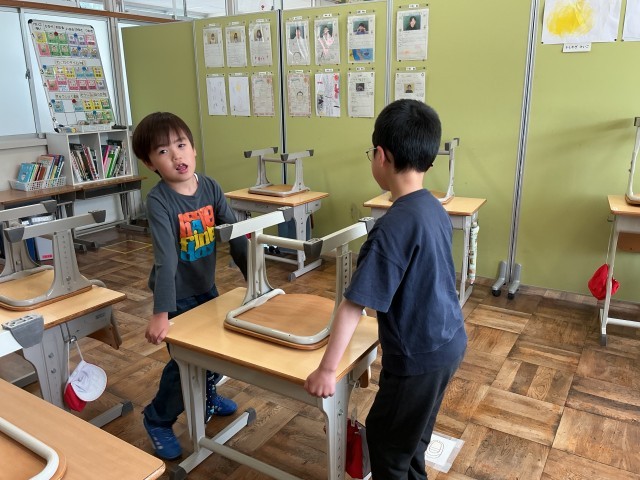 力を合わせて机を運んでいます。
