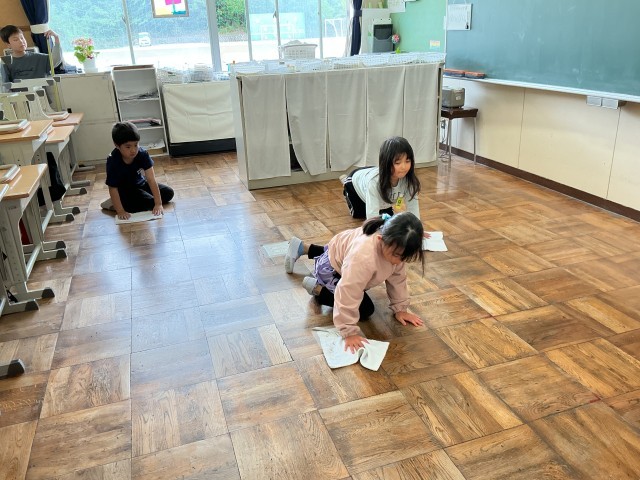 みんなで協力することで、1年生も上手に掃除ができています。
