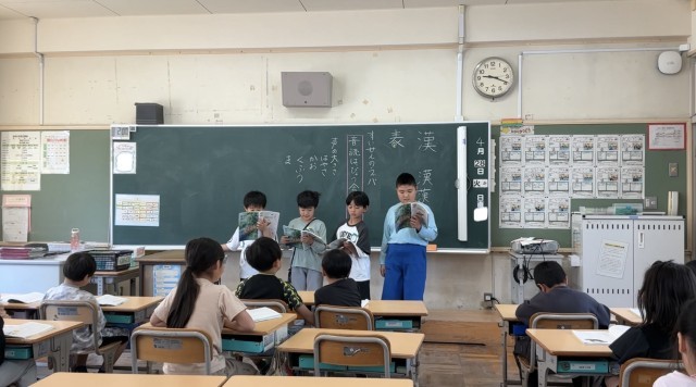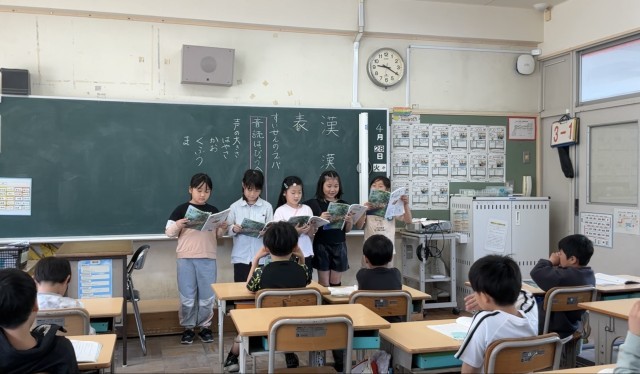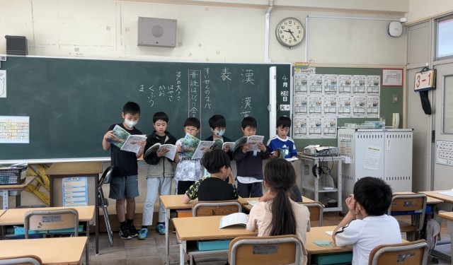 3年生 国語 公開日 2026/04/28 更新日 2026/04/28 各学年から すいせんのラッパの音読発表会をしました。好きな場面を選んでグループを作り、声の大きさや速さを意識して読みました。 +1