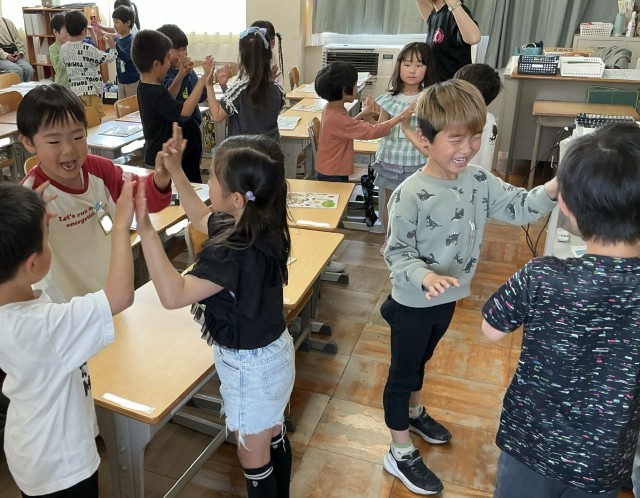 「うたっておどってなかよくなろう」という単元で、音楽に合わせて友達とタッチしたり動きを考えたりしました。