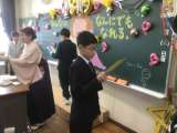 完成したお祝いメッセージをバックに卒業生へのプレゼント贈呈。 特別支援学級の子ど...