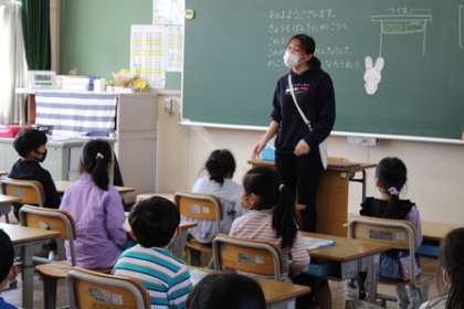 1年生は、良い姿勢で先生の話をしっかり聞いたり、トイレの使い方を練習したりしていました。