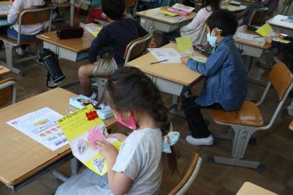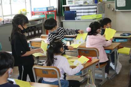 1年生を迎える会の招待状を、6年生が1年生に渡しました。かわいいイラストの入った招待状に、1年生は大喜びです。当日が楽しみです。