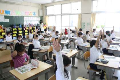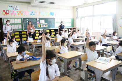 5月14日 子ども園の先生方が、1年生の授業の様子を見に来てくださいました。算数の「なんばんめ」の単元を、楽しく学んでいる様子を見ていただきました。みんな、張り切って手を挙げて発言しています。久しぶりに先生に会えて、嬉しかった様子です。