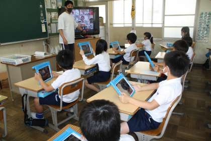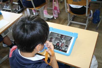 5月18日 3年生が、学習用タブレットを使って、学級で会議形式で学習を行いました。離れた場所でも、画面上で顔を見て会話をすることができます。はじめは戸惑っていた子どもたちも、徐々に慣れて、使えるようになってきました。