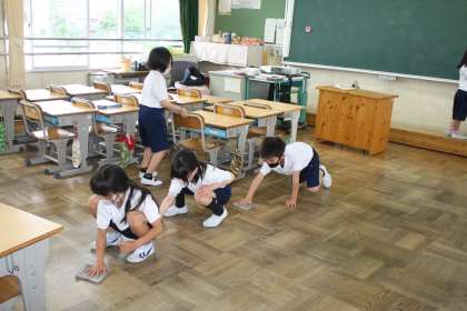 5月20日 朝の児童朝会で「清掃のやり方」を美化委員会から説明してもらいました。給食後の清掃では、床を拭くときは、前の人が拭いたところと間を開けないことや、机を運ぶときは床に引きずらないように心がけて掃除をすることができました。