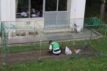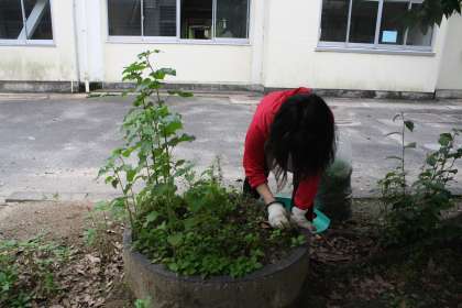 5月24日 3年生が牛乳パックで育てているひまわりや、ホウセンカが少し大きくなったら、花壇に植え替えて育てます。もうじき、5年生がツルレイシの種を植えます。そのために、花壇の草取りや畑の整備を、校内整備員の方や先生がしています。きれいな花が咲くといいですね。