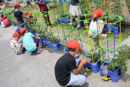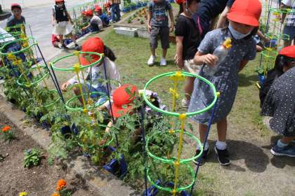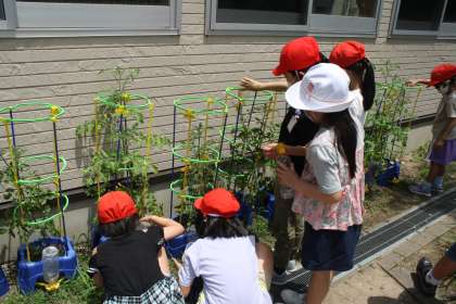 2年生が、ゴールデンウィーク明けに植えたトマトが大きくなってきました。もう、緑色のトマトが20個近くなっている子もいます。「おねえちゃんにあげる」「トマトケチャップを作りたい」など、嬉しそうにお話をしていました。トマトがなるのが楽しみですね。