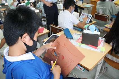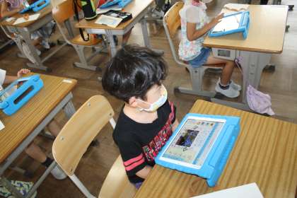 各学年で、学習用タブレットを活用した授業を行っています。6年生は、図工でデザインをするときに、参考になる絵を探すために活用しました。1年生は、朝顔の成長の様子を記録するために、活用しました。どの子も学習用タブレットを上手に操作できるようになってきました。