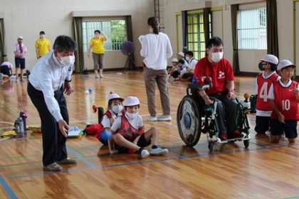 4年生が体育の授業で、ボッチャ(重度運動障がい者のために考案されたスポーツ)に取り組んでいます。この日は、ボッチャ協会の方や教育長も来てくださいました。ボッチャ協会の方からは、「3週間前よりもずいぶんうまくなったね」とほめられました。子どもたちは、「障がい者の方は、上手だった。」「障がい者の方といっしょにやれてうれしかった」と感想を言っていました。