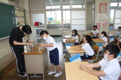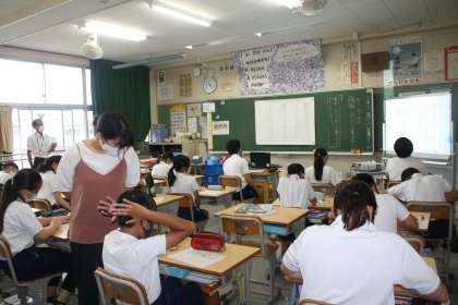 9月からの授業が始まり、子どもたちは落ち着いて学習に取り組んでいます。上の写真は、2年生がビーカーを使って算数科の容量の学習をしているところです。真ん中の写真は、3年生が書道に取り組んでいるところです。丁寧に書けるようになってきました。下の写真は、6年生の国語科の授業です。より良い授業になるよう、授業アドバイザーに助言をいただいています。
