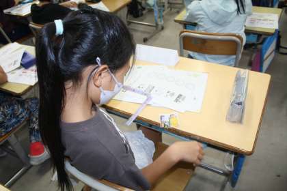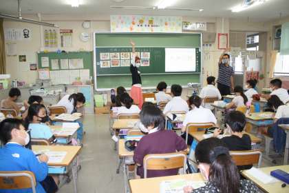 4年生が外国語活動で「何時に何をするか伝えよう」の学習をしました。「ホームワーク ファイブpm」「ブレックファースト セブンam」など、伝え合いました。発言をするとルア先生から担任の先生の顔写真があるカードをもらい、喜んでいました。