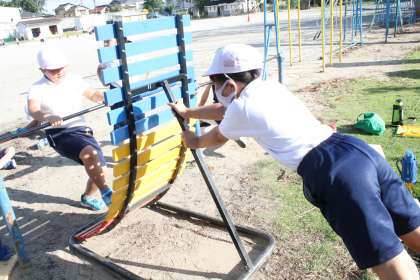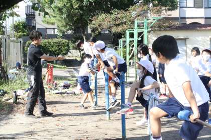 4年生が、鉄棒運動にチャレンジしています。足掛け逆上がりでは、膝の裏を痛めないように鉄棒カバーを使ったり、逆上がりでは補助板を使って練習をしています。できないことができるようになるために、一生懸命に練習している姿は、とてもかっこいいです。