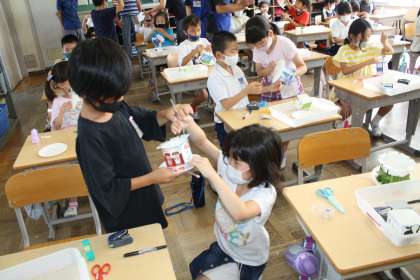 2年生が、物づくりサポーターの方に教わり、「トコトコくるま」と「ダーツ」を作成しました。工程が多く、難しかったけれど頑張って作りました。作り方がわからないお友達に、教えている姿がありました。