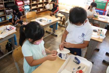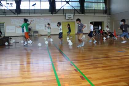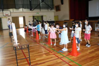 2年生が、「トコトコ車」と「ダーツ」を作りました。作った作品を、体育館で実際に動かしたり遊んだりしました。