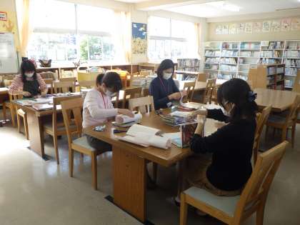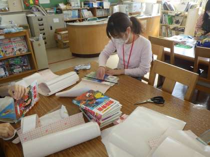 学校サポーターの中の「図書ボランティア」の方々が、図書館の本の修理をしてくださいました。日に当たって表紙が汚くなってしまった本に透明なカバーを付けてくれました。カバーを貼るときに、空気が入らないように丁寧に定規で伸ばしています。ボランティアの方は「楽しい」と言っていました。楽しくて、子ども達のためになる活動です。みなさんも、一緒にやってみませんか。