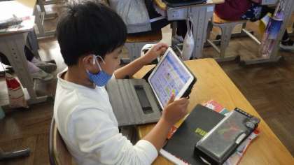 タブレットに自分で地図を描いて、ALTのルア先生に、目的地までどのように行くのかを英語で説明します。