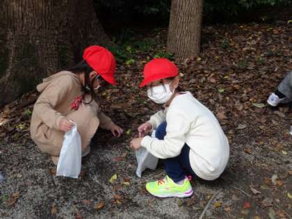 どんぐりや葉っぱ、虫など秋の生き物をたくさん見つけて、子どもたちは大喜びです。