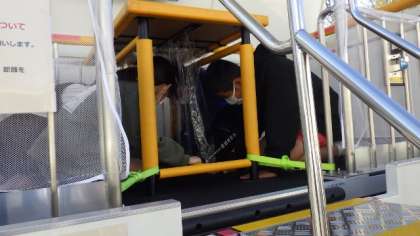 机の下にもぐって、机の脚をつかみ、体を守りました。