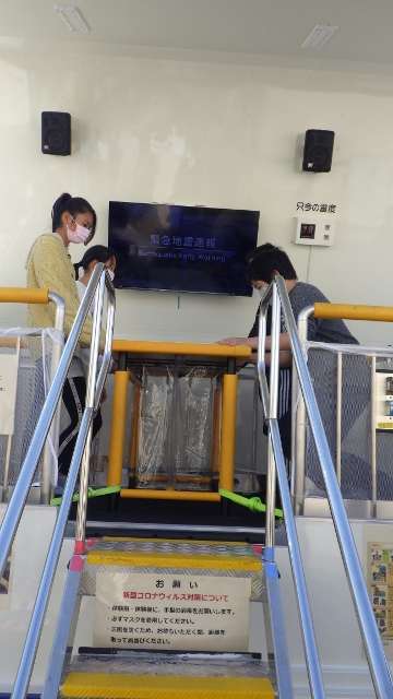 東日本大震災や阪神淡路大震災等を想定して、震度6程度の揺れを体験しました。たった1分間がとても長く感じられました。