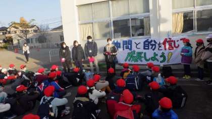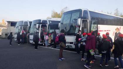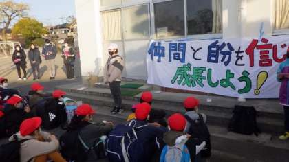 学校で出発式を行い、出かけていきました。