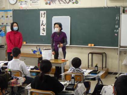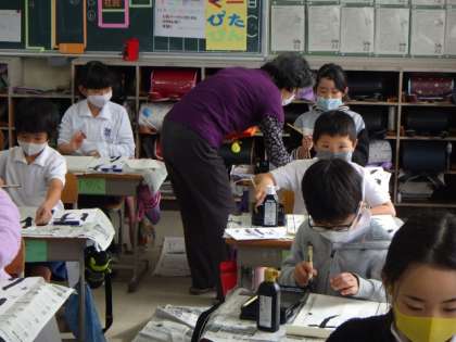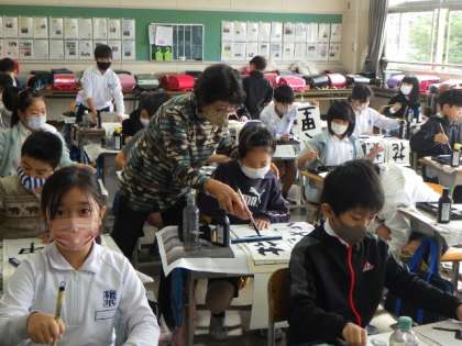 3,4年生の書写の時間に、書写ボランティアさんが来て、習字での書き方を教えてくれました。筆遣いは難しいけど、毛筆は楽しかったようです。
