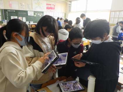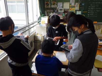 水害に遭ったら、どこへどのように避難したらよいかを、学習用タブレットを使って調べています。