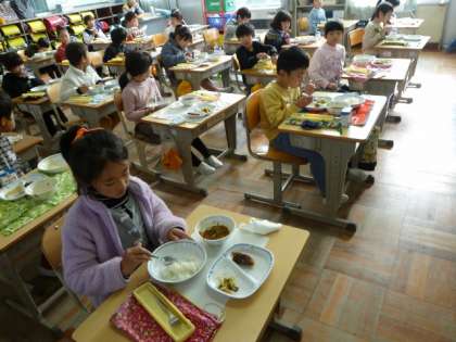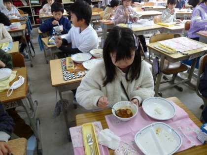 今日の給食は冬至献立で、カボチャのみそ汁と魚のゆず風味揚げでした。